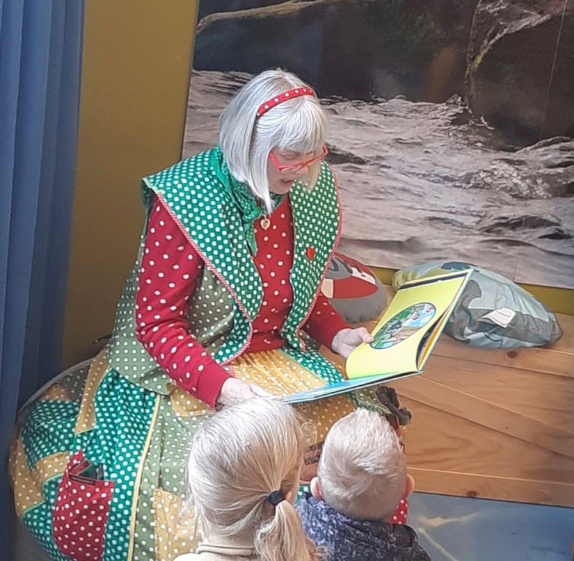 Het avontuur wordt eerst door mij voorgelezen. De poppen zitten verstopt in de zakken van mijn rok.