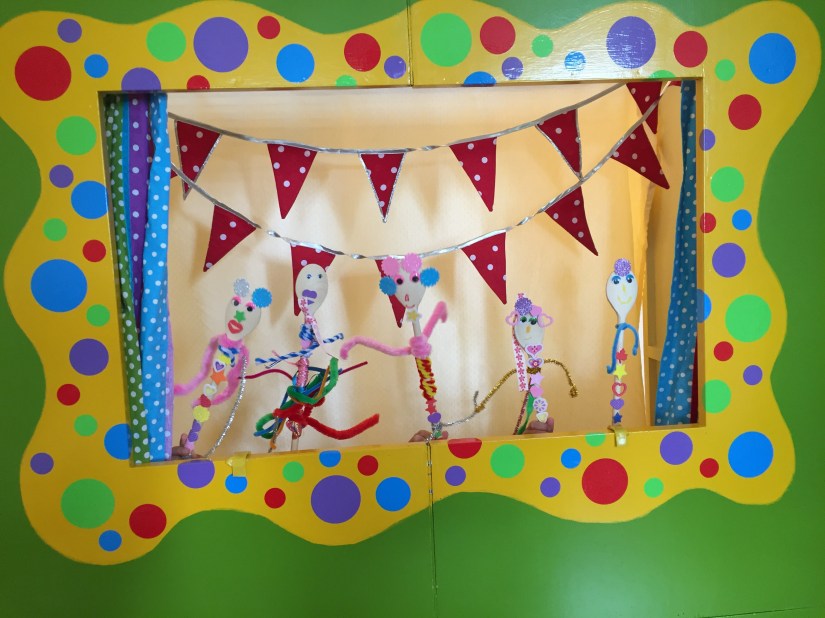Daarna knutselen de kinderen een pollepelpop. Met deze pop spelen de kinderen de door henzelf bedachte verhalen in de grote poppenkast die ik ook meeneem.