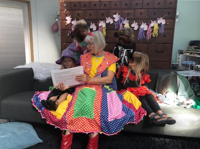 Het avontuur wordt eerst door mij voorgelezen. De poppen zitten verstopt in de zakken van mijn rok.